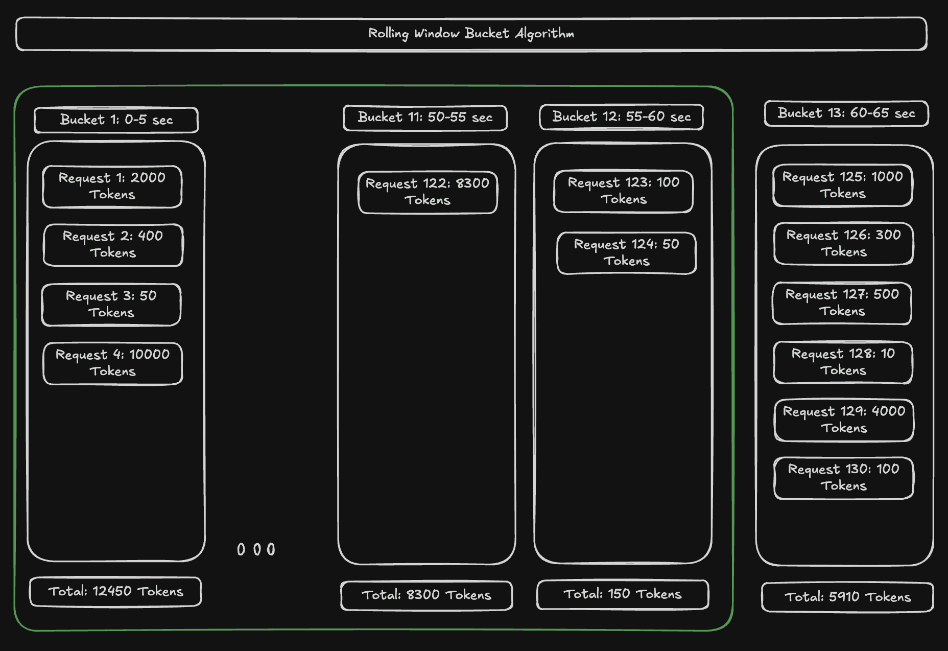 We went back to basics, researched industry approaches, and landed on the rolling window algorithm: a method that groups all requests within a time window into a single bucket, storing usage as a simple key-value pair. We wrote the bucket implementation from scratch using our own custom LUA scripts and patched it into the package. The Redis call overhead dropped dramatically. While it's an approximate estimation compared to the full preciseness of Leaky Bucket, you can increase the number of buckets to get comparable accuracy. For our use case, it was the perfect fit.