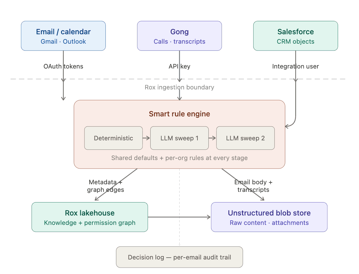 This is the reason at Rox we built a multi-stage ingestion pipeline that combines deterministic rules and intelligent LLM sweeps. Every stage evaluates emails against shared defaults layered with org-specific rules, giving each customer full control over what enters their system. This email ingestion engine fits into a set of smart rule engines shown below in Figure 1 that process incoming data only persisting relevant, anonymized and policy-compliant information while filtering out noise, sensitive leakage, and non-essential content.