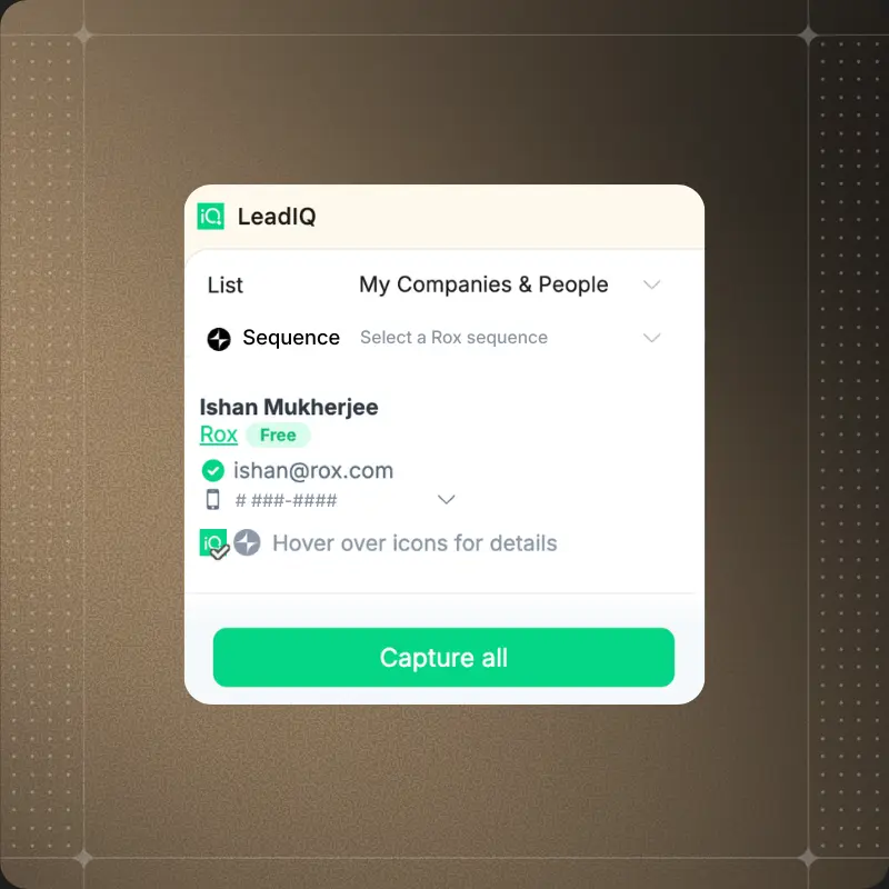 Capture contacts with the LeadIQ extension + send them directly to a Rox sequence in one click.